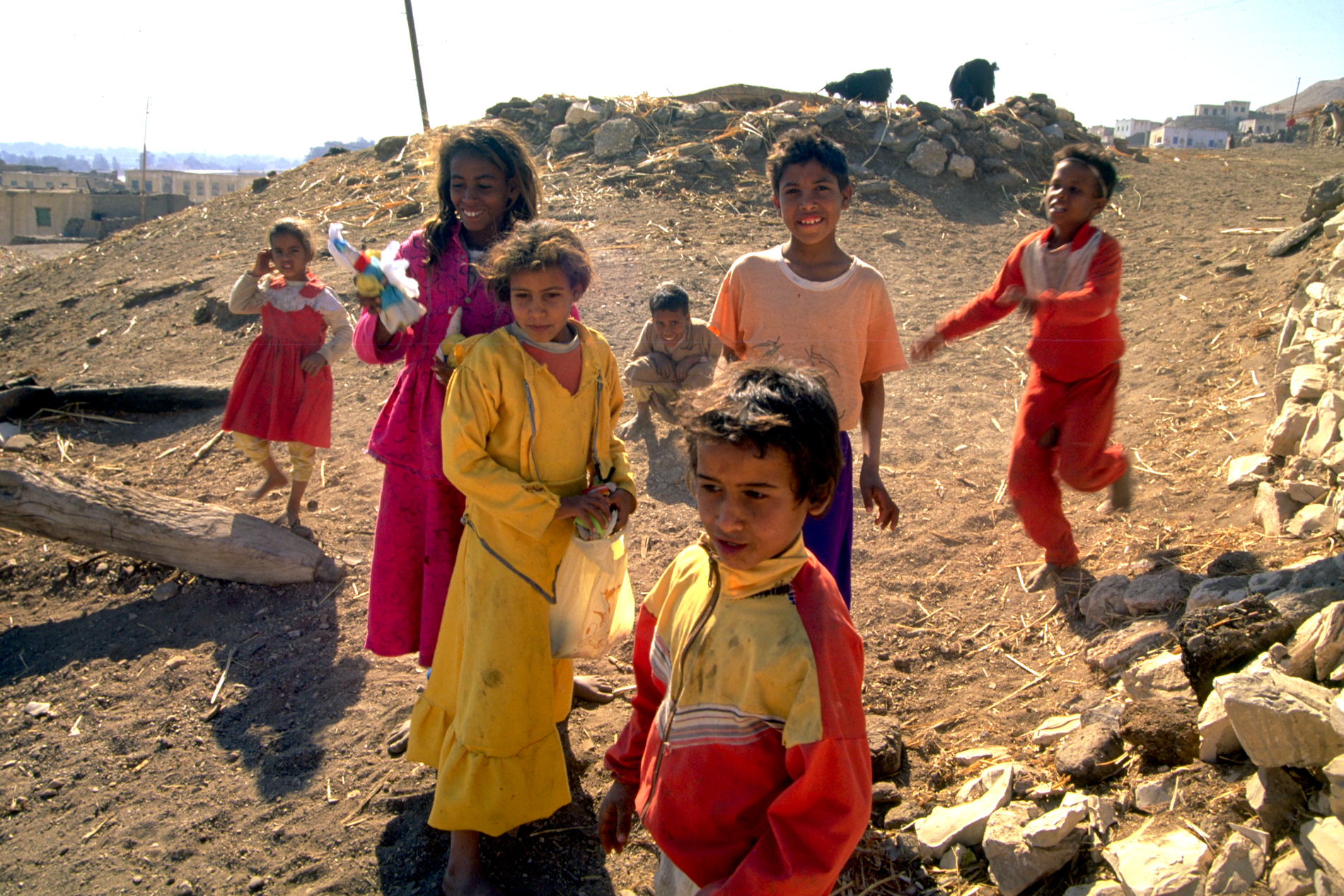 [caption id="attachment_1826" align="alignleft" width="1024" caption="the children in valley of the nobles"][/caption]   Sometimes the now, the moment, the present, must take precedence over the old, the past, the gone... We were at the valley of the Nobles, an area of stone cut tombs dedicated to the nobles and high officials of ancient Egypt on the west bank of the Nile, and near the entrance to the tombs, my attention was caught by wave of color and giggles. A group of children in bright colored clothing were trying to get my attention to sell me rag dolls that they fashion in their image. I saw their faces, began to speak to them in Arabic and I was suddenly utterly charmed by their effervescence and the tombs were forgotten. Life was calling and it demanded my attention. They took my hand and led me to their tiny one room houses, one house after the other, introducing me to their parents, laughing and running around me and the whole time singing a song that they made up on the spot about my name. It was a precious happening for me and one that I will carry with me forever. At that moment, I followed my heart and decided that playtime with the living is way more important than seeing the old tombs of the dead.