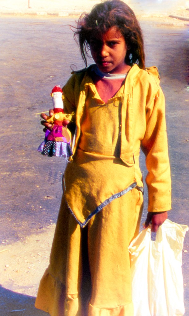[caption id="attachment_1830" align="alignleft" width="611" caption="the girl and her doll"][/caption] We create art inspired by what we see around us, what touches us, what we live with... The children at valley of the nobles on the west bank of the nile near Luxor carry around dolls that they sell to tourists for a fraction of an Egyptian pound. The strangest thing about these dolls is that they are almost copies of the girls themselves. They are sewn from rags and dressed in miniatures of their own colorful homemade dresses. I still treasure the doll I bought from them and take with me from country to country wherever I move. I wonder what it will be like going back there after the 15 years. Will these dolls still exist? Or are the children selling dolls mass produced in China? I sure hope not...