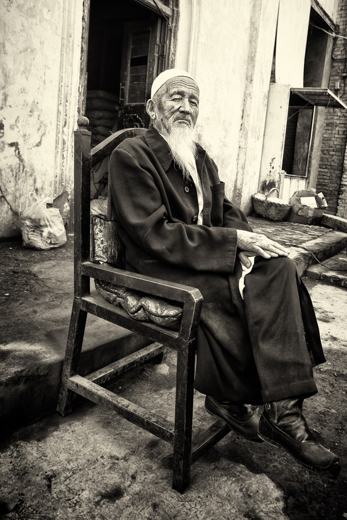 I asked this lovely man to photograph him outside the old teahouse in Kashgar and he agreed but asked me to wait. He positioned the chair where he wanted it, smoothed his coat and placed his folded hands across his knees and only then he gave me the signal to go ahead.