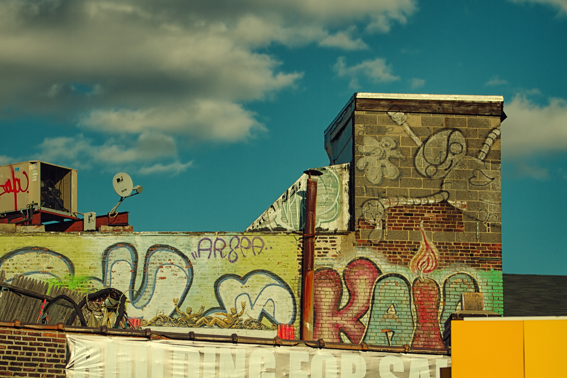 In a dense city like New York, having a rooftop or access to one is as precious as gold. It the place where you can 'breathe', where you can see a part of the sky that is larger than a matchbox and it is in many ways like going on vacation. So many things take place on New York rooftops, parties, hide outs, secret kisses, sunbathing, art, smoking, drinking and simply chilling. Oh, and also most films like to have their chases on at least one rooftop where the actor makes these impossible jumps from building to building. I was really caught by some colorful rooftops I saw on my last trip to New York, in this case, in Brooklyn.