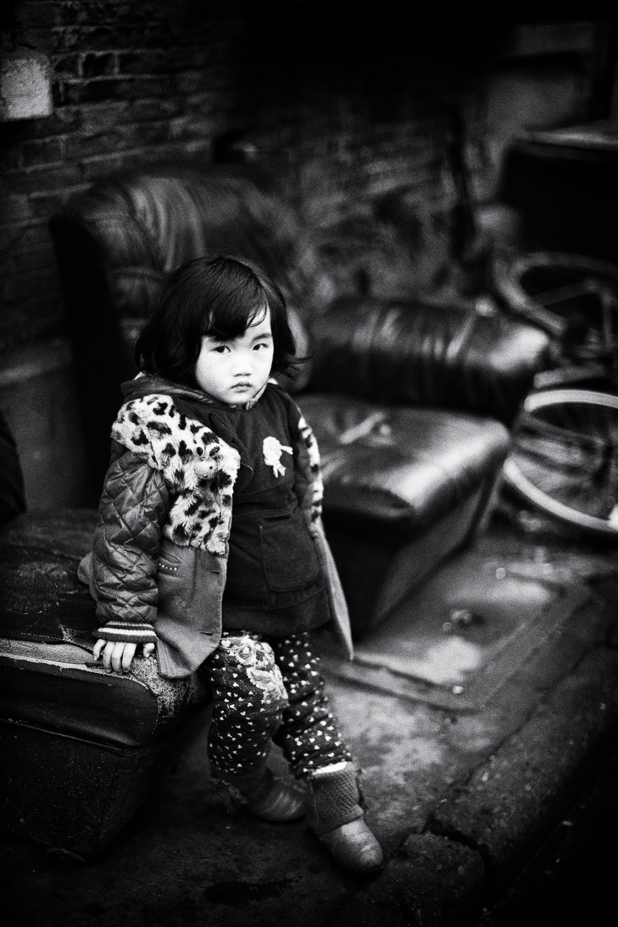 I have often tried to describe in so many different ways why I love street photography so much above any other style, but then come moments to me in the streets that redefine it all for me, the whole love affair. Today, I received this incredible gift, a window opened, a moment magically presented itself and I was showered with an overwhelming emotion at the magic of it all. A shabby alley in a condemned neighborhood of Shanghai, perhaps a month away from certain demolition, a little girl with an angelic face, an old worn out leather sofa juxtaposed on the side of the alley in a most unusual place, an old bike nearby and her face searching mine making time stop, and me with a heart beating very fast raising my camera to try and capture magic through the lens and knowing it will be an image I would treasure for the rest of my life.