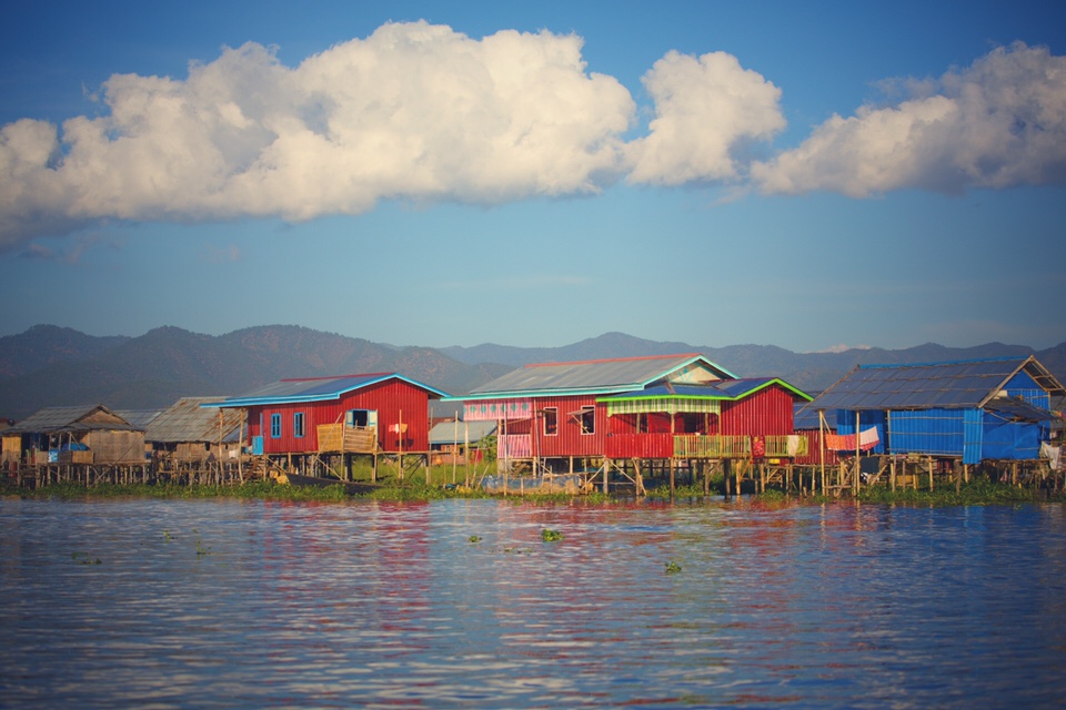 Colorful stilt houses on a reflective lake under white puffy clouds, a background of hills touching the sky and simple happy people navigating the waters. This creates magic and I can look at this scene again and again and be lost in its charm.