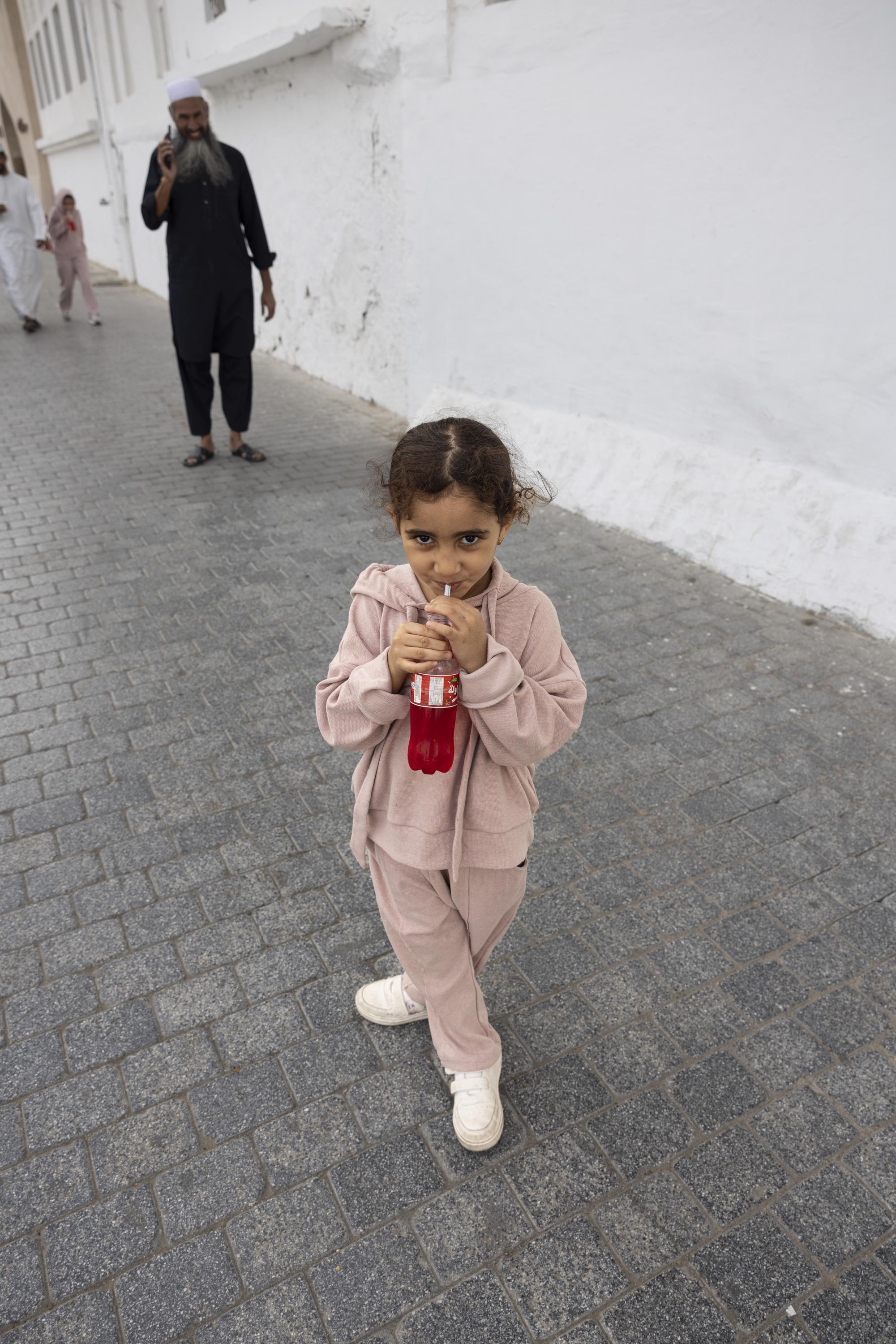 Walking through the sunlit streets of Muscat, Oman, I am greeted not just by the architecture or the gentle breeze off the sea but by the faces of its people. There’s a profound connection that occurs when you meet someone’s gaze through the lens of a camera. Like the young girl in her pastel outfit, clutching a bright red soda with a curious yet shy expression. Her innocence radiates a universal charm that transcends culture, reminding me that the language of humanity is unspoken yet deeply understood. Behind her, life goes on – a man engrossed in a phone call, contrasting the purity of her focus. These moments, fleeting yet monumental, are what keep me seeking the streets with my camera in hand.