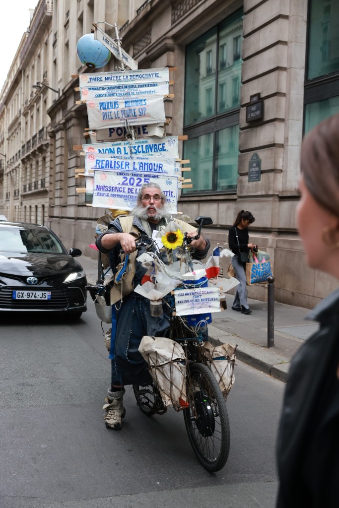 Walking the streets of Paris this past weekend, I found myself face to face with this man—riding a bike, overloaded with signs, declarations, and visions of a world he so desperately wants to change.