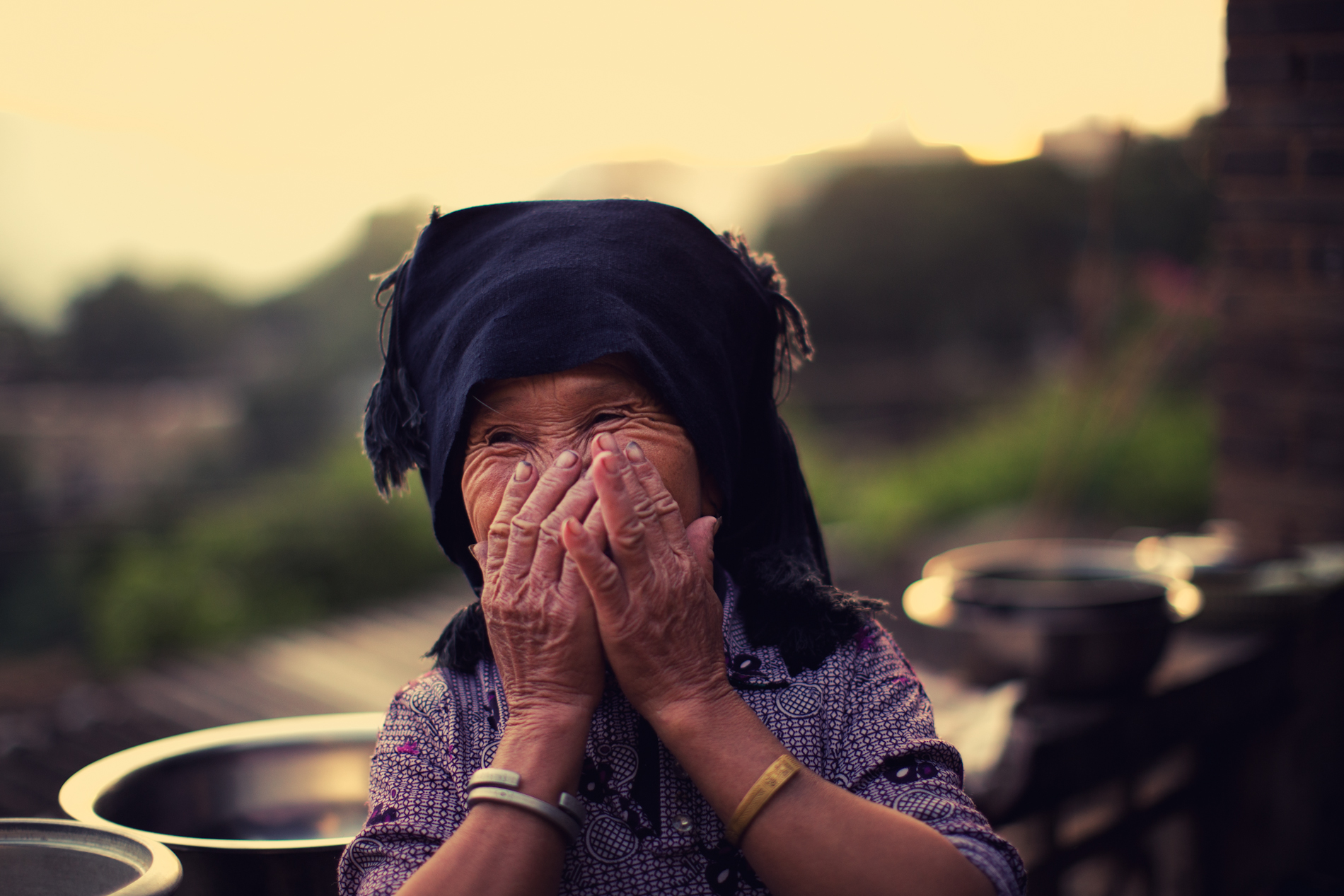 There’s a kind of laughter that holds more than just humor. It carries memory, resilience, and the ability to find joy no matter the circumstance. This woman, caught in a quiet moment just before dusk, covered her face as she laughed. The gesture was shy, but the expression that followed told its own story.